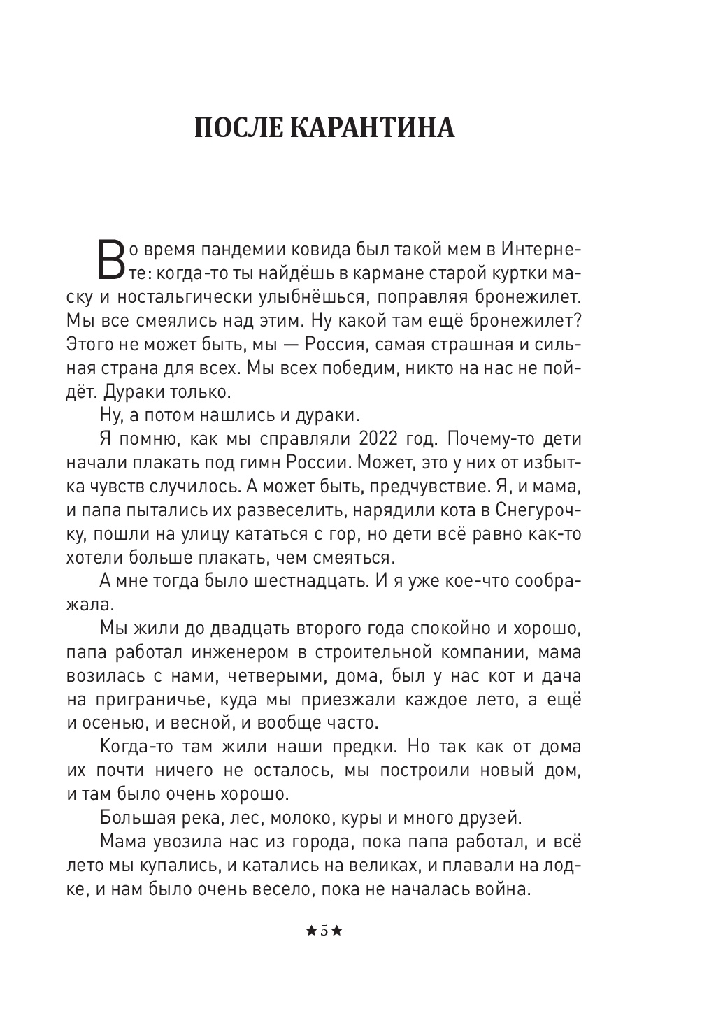 Екатерина Блынская не боится говорить о том, что происходит с детьми, оказавшимися на театре боевых действий, о силе любви и ответственности за младших, о пробуждении забытых чувств, о настоящих ценностях, приходящих к нам тогда, когда больше ничего не осталось. Какими станут дети, спасающие себя от странного мира воюющих взрослых, и честно ответят, как остаться собой, идя наощупь и только «по звёздам».